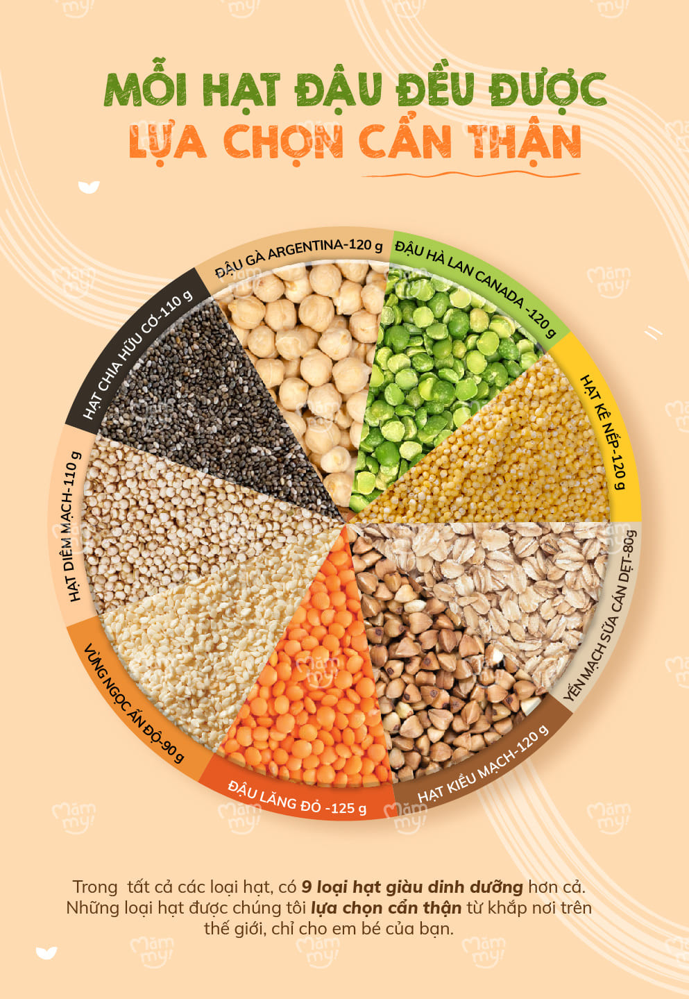Đa dạng thực đơn: Hỗ trợ mẹ trong việc xây dựng thực đơn ăn dặm đa dạng, giúp bé làm quen với nhiều loại hạt khác nhau.